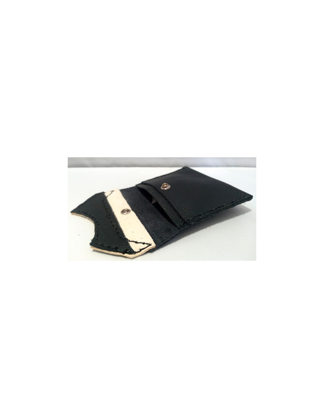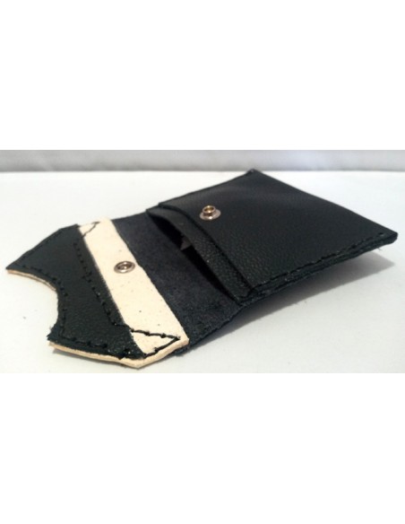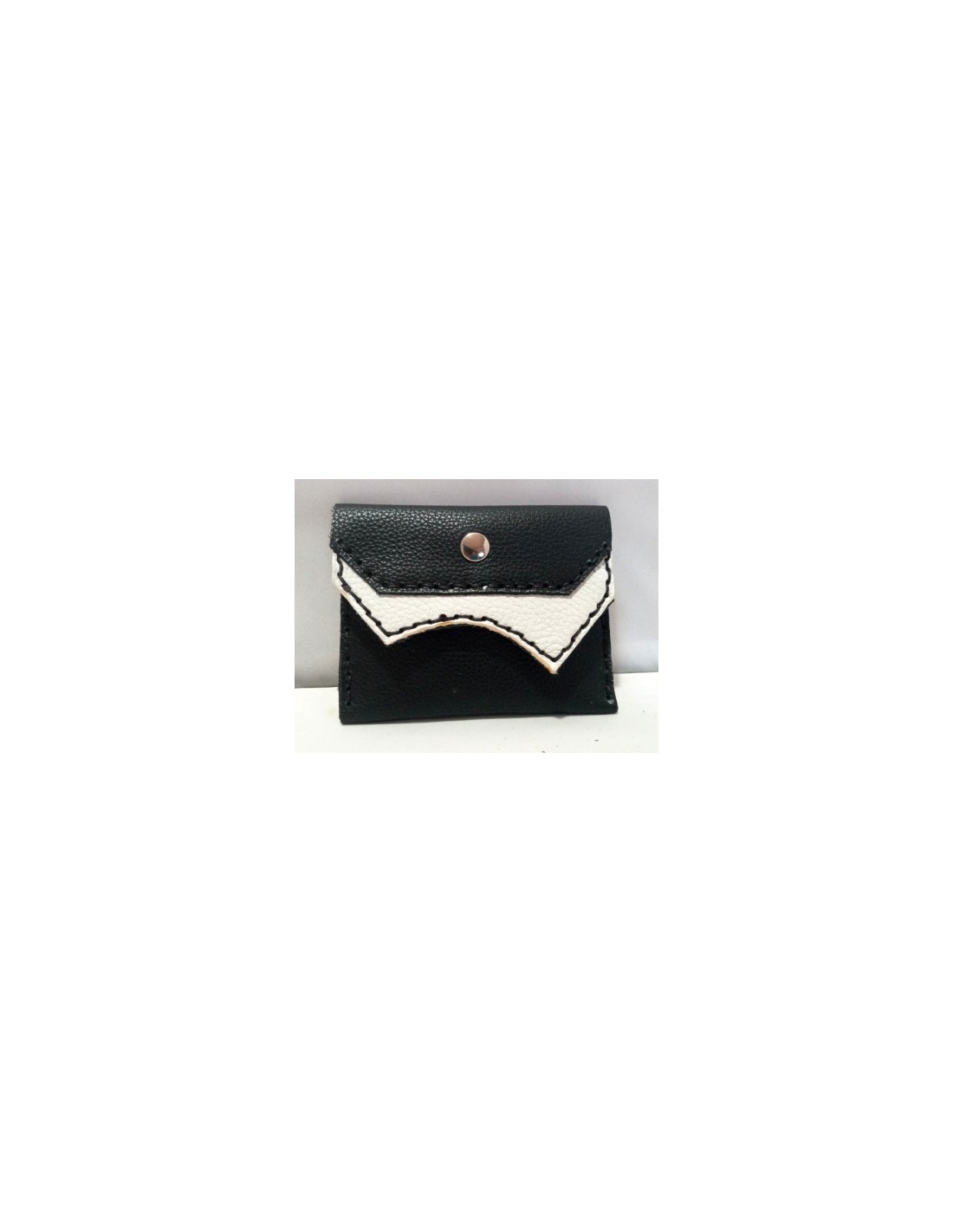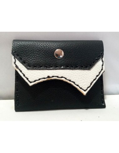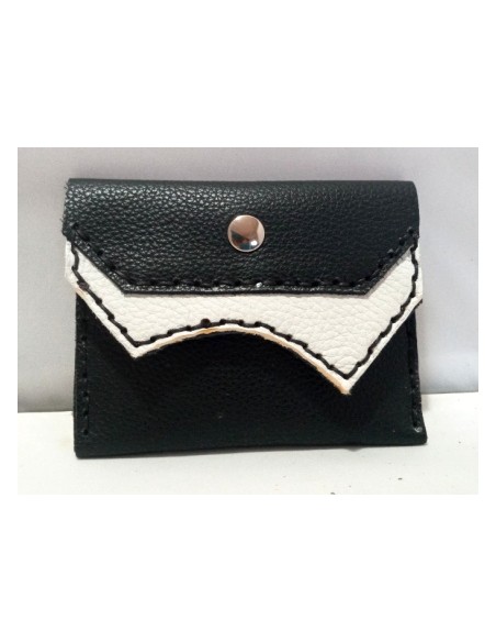 Portafoglio in pelle, cucito a mano. Misure 12,5cm x 9,5cm. Colore nero e bianco. Chiusura con bottone. All'interno ha due taschini.