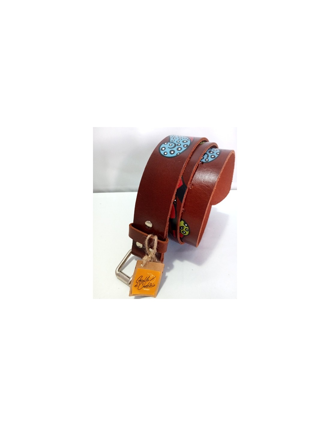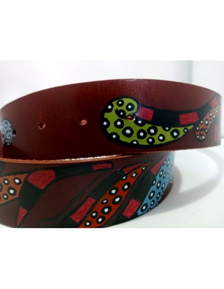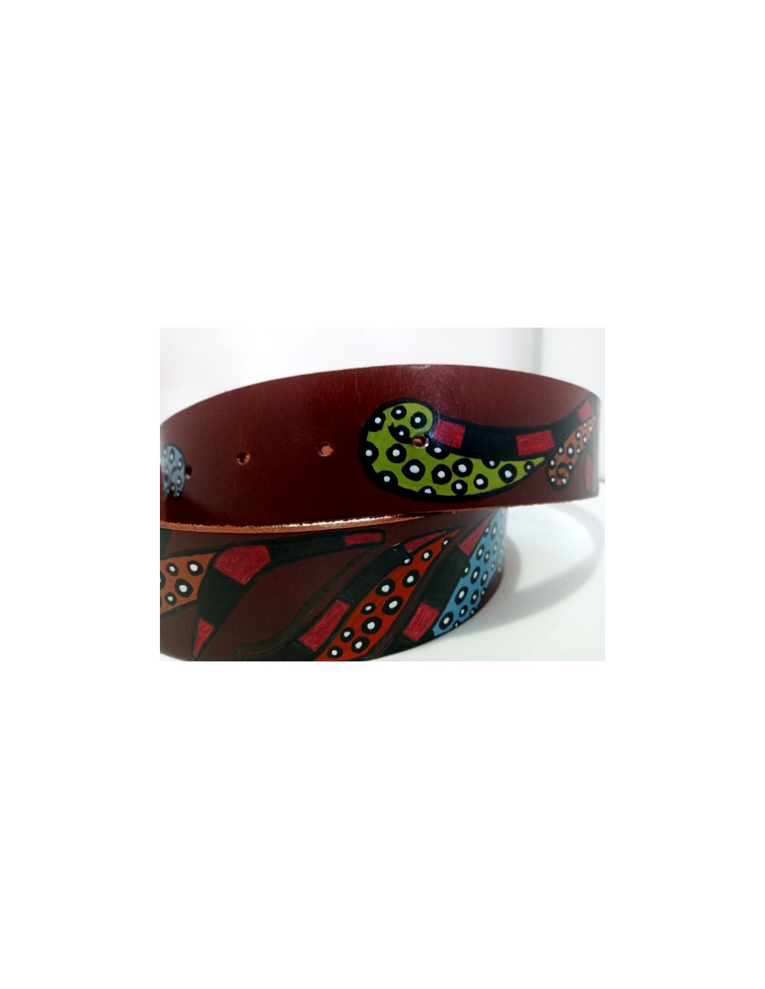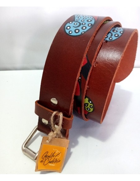 Cintura in cuoio, fatta e dipinta a mano. Colore marrone. Fibbia color argento. Altezza 4cm, lunghezza standard. Si puó anche fare su ordinazione. Dipinta a mano con colori per pelle. Per la pulizia utilizzare un pezzetto di cotone con latte detergente.