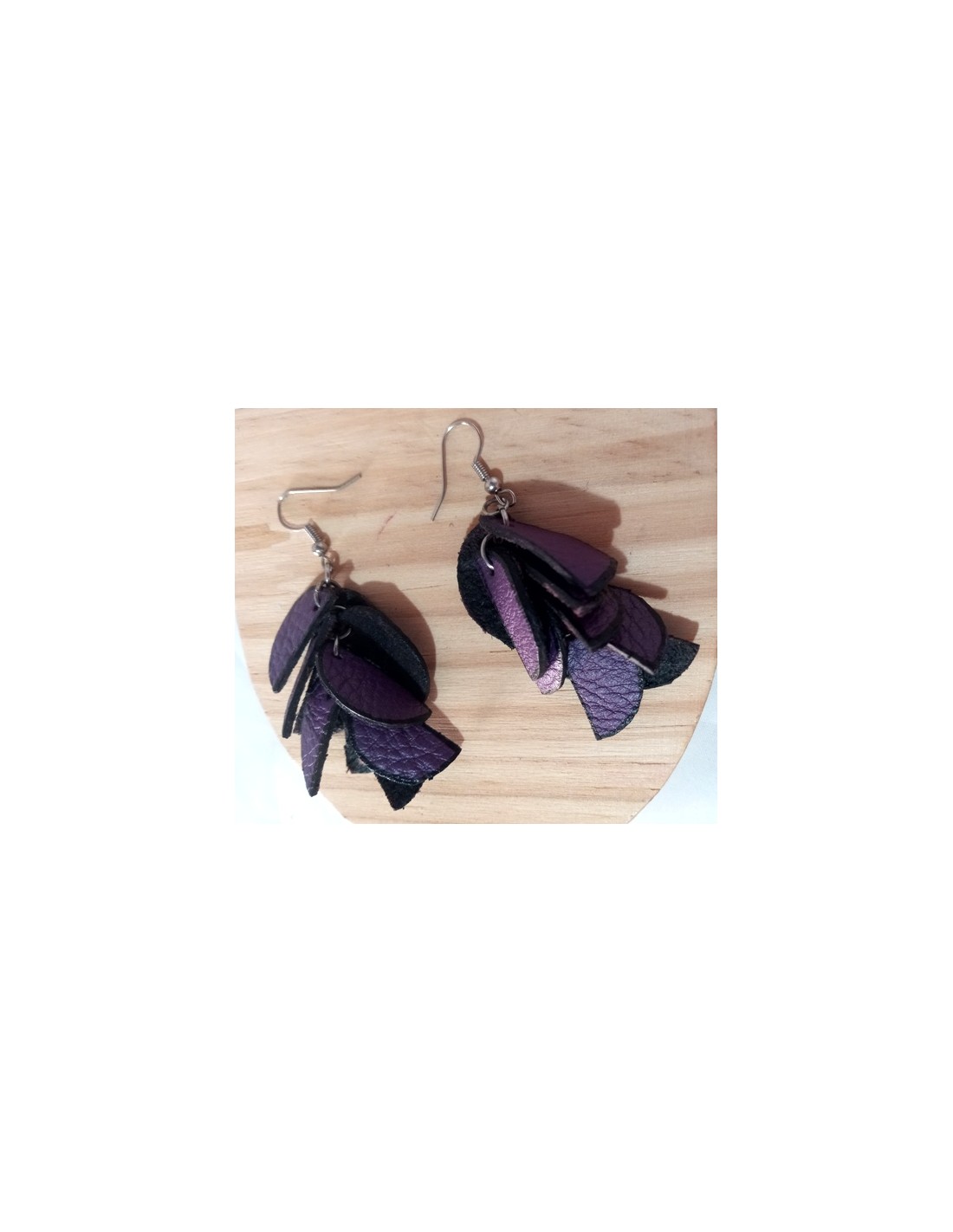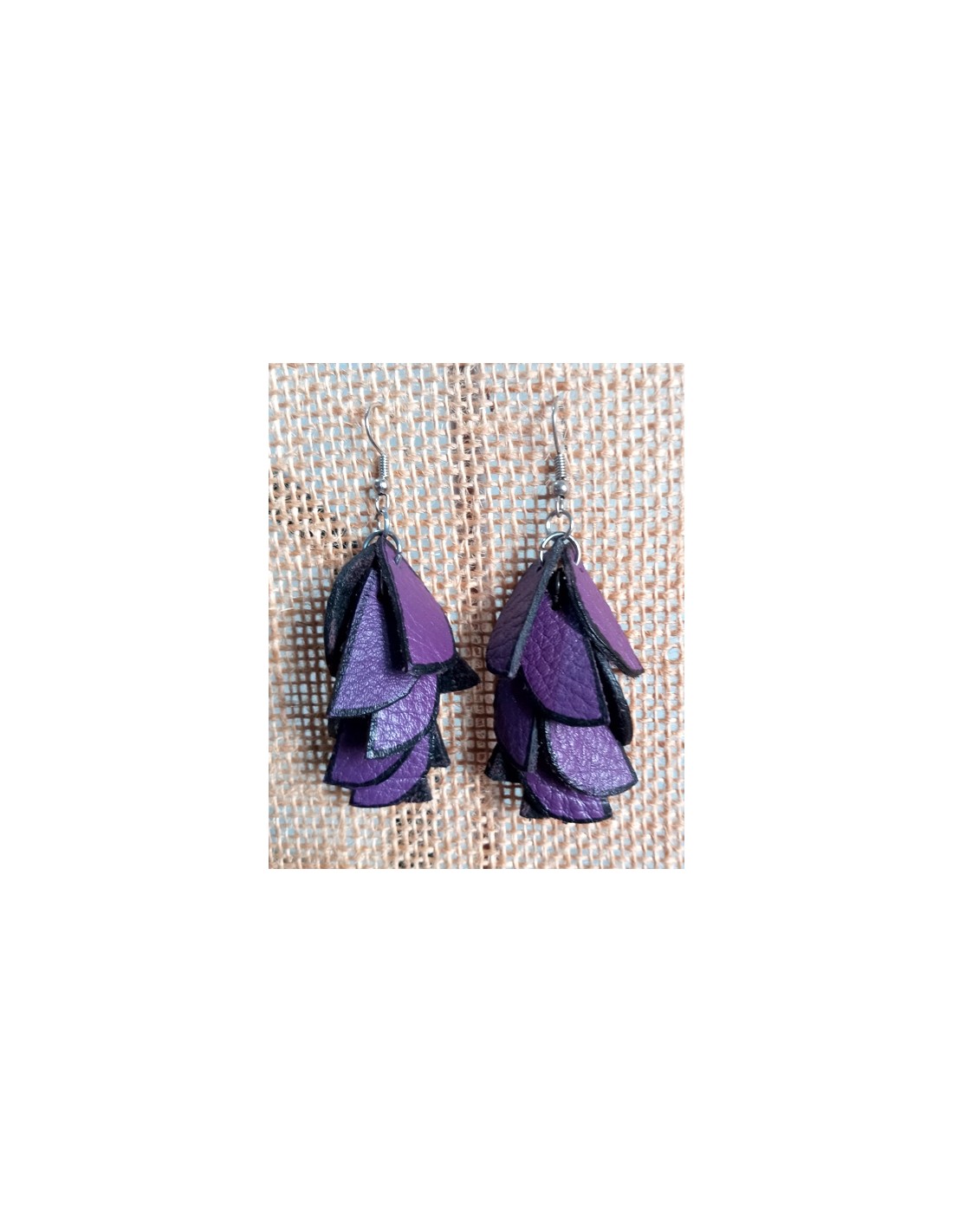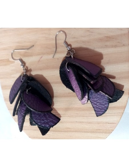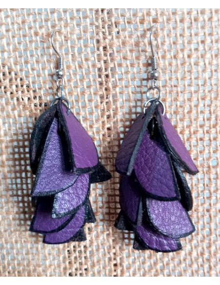 Orecchini in pelle, fatti a mano. Composti da tante piccole mezzelune in pelle. Ganci in argento 925. Colore viola con bordature nere.
