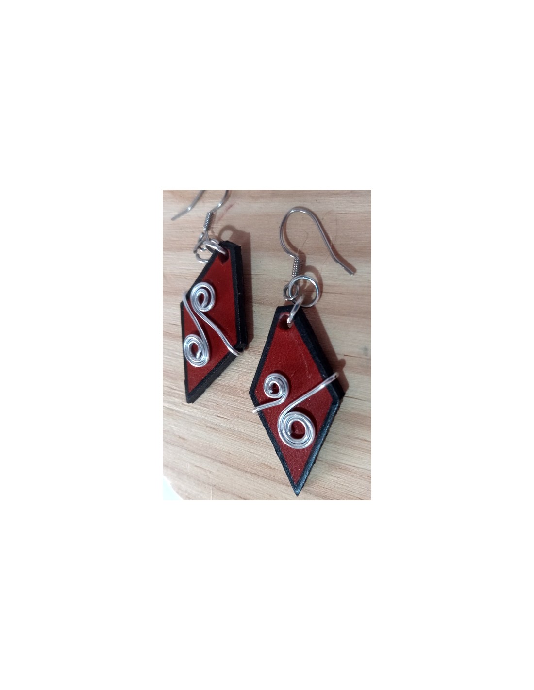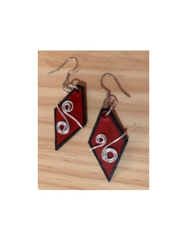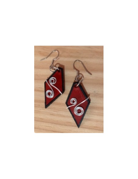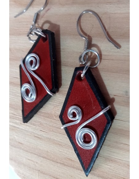Orecchini in cuoio, fatti a mano. Composti da un rombo in cuoio e alluminio. Ganci in argento. Colore rosso.