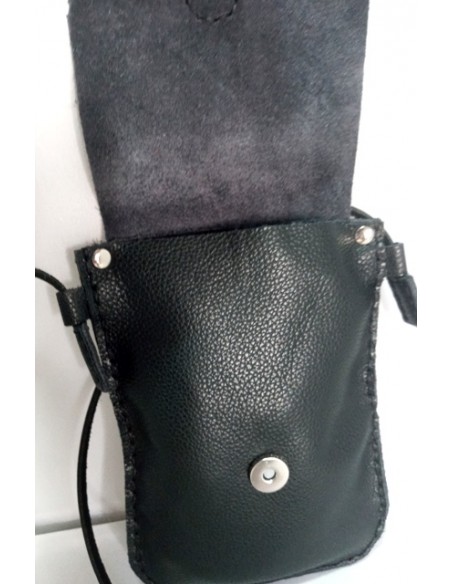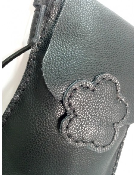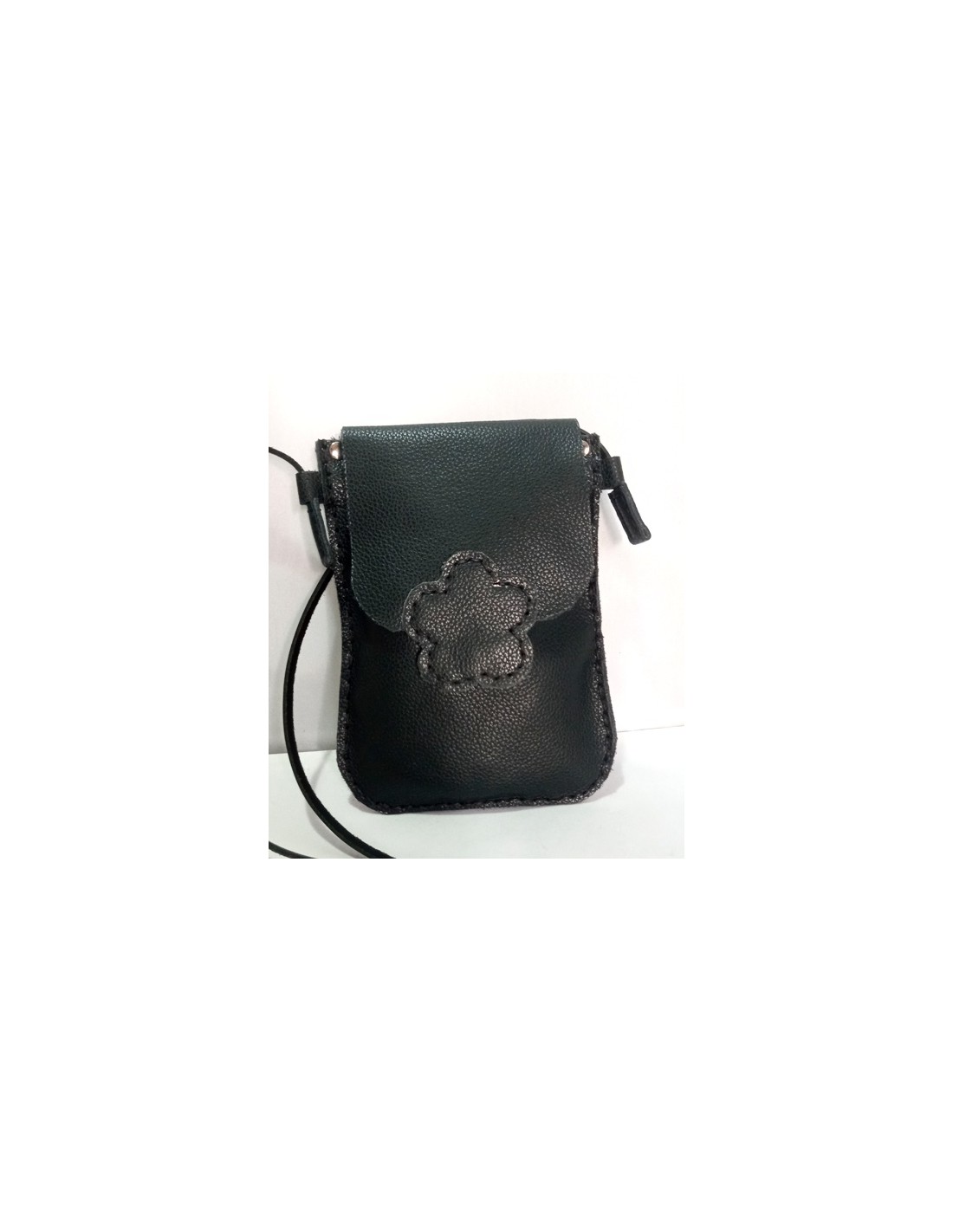 Borsetta Fiore, in pelle, cucita a mano. Misure 15cm x 20cm. Colore nero con fiore nero e cuciture con filo nero. Chiusura con calamita e tracollina in cuoio fissa. Ideale per portare il telefono cellulare.