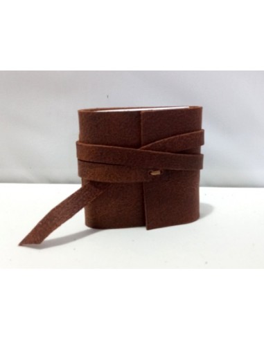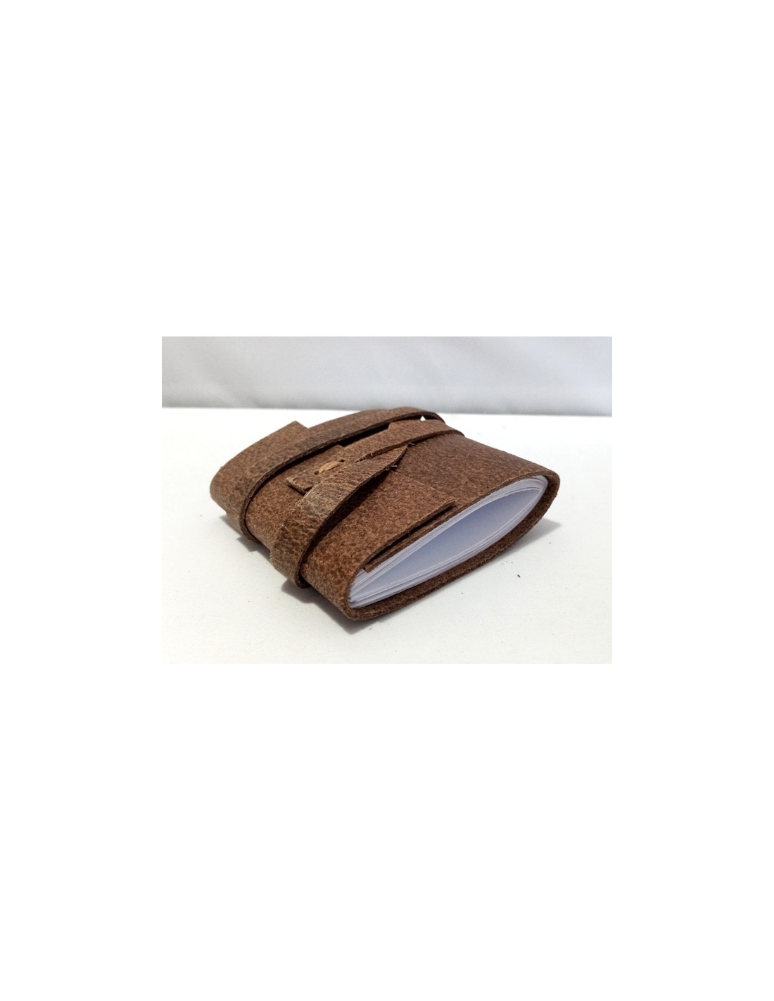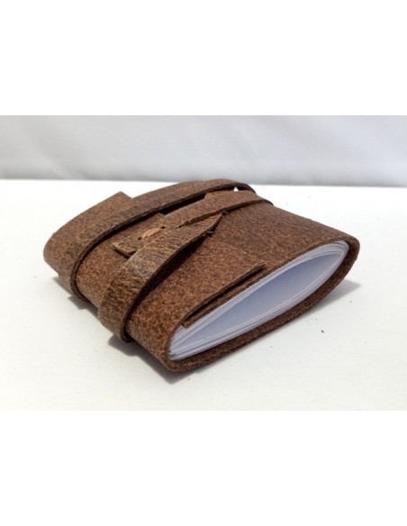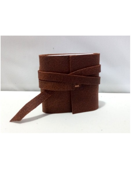 Mini taccuino in pelle, fatto a a mano. Misura 8cm x 7,5cm. Colore marrone. Si chiude con laccio. Fogli senza righe. Si possono incaricare in varie misure e personalizzati con disegni o dediche a pennello o con pirografo.